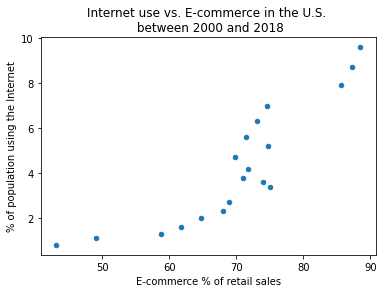 Finally, I created a scatter plot comparing Internet use in the U.S. and E-commerce as a percentage of total retail sales in the U.S.