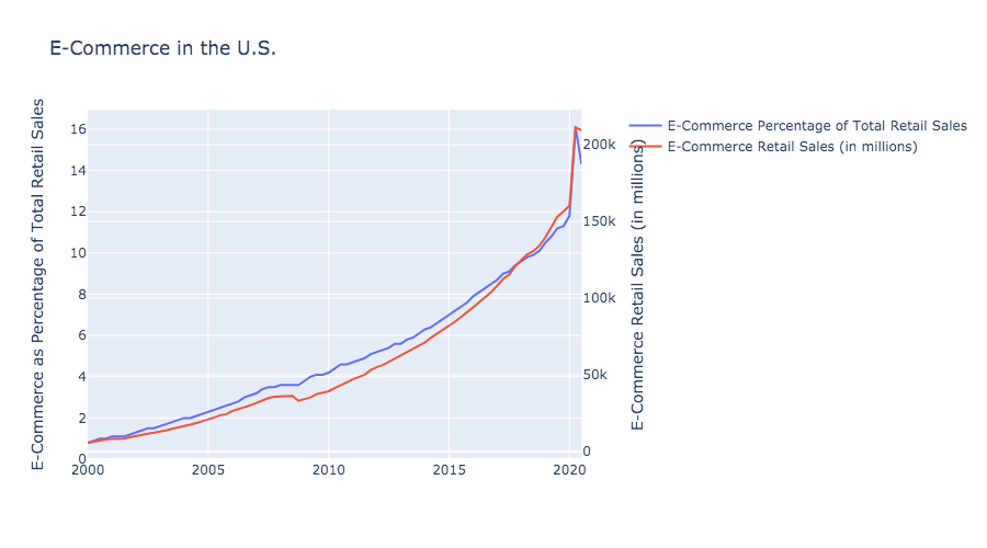 I created another line graph comparing e-commerce as a percentage of total retail sales to e-commerce retail sales in millions of dollars.