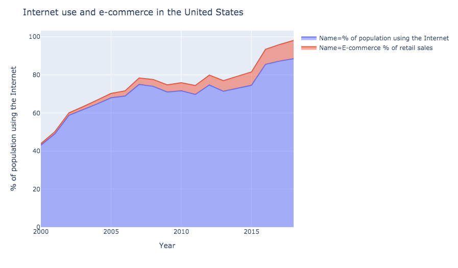 I created a stacked area graph comparing Internet use and e-commerce as a percentage of total retail sales.