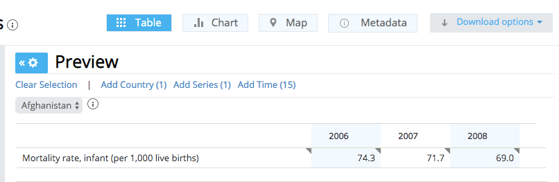 Say you want to make a visualization about child mortality rates in various countries. There are all sorts of data sources on the Internet where you could get this information, but I’m using World Bank in this example.