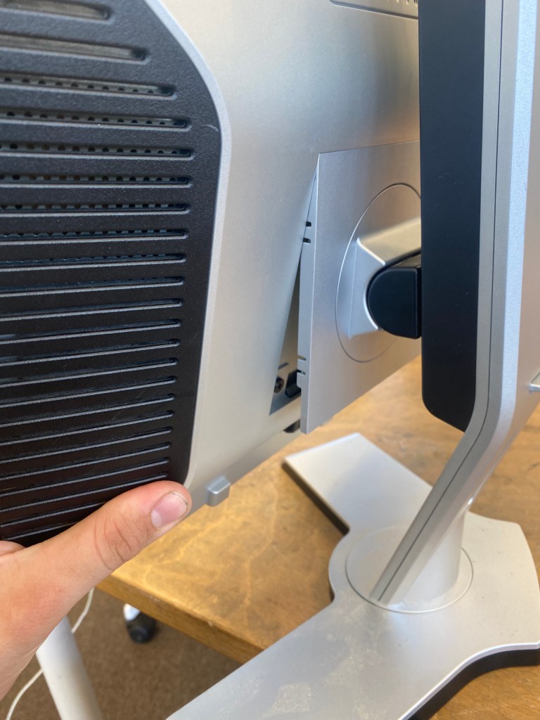 Step One: You are going to want to remove your monitor from the stand. Since we are using an old Dell monitor. All we had to do was press a button and slide the monitor off of the stand.