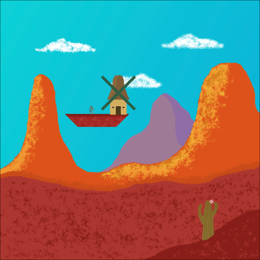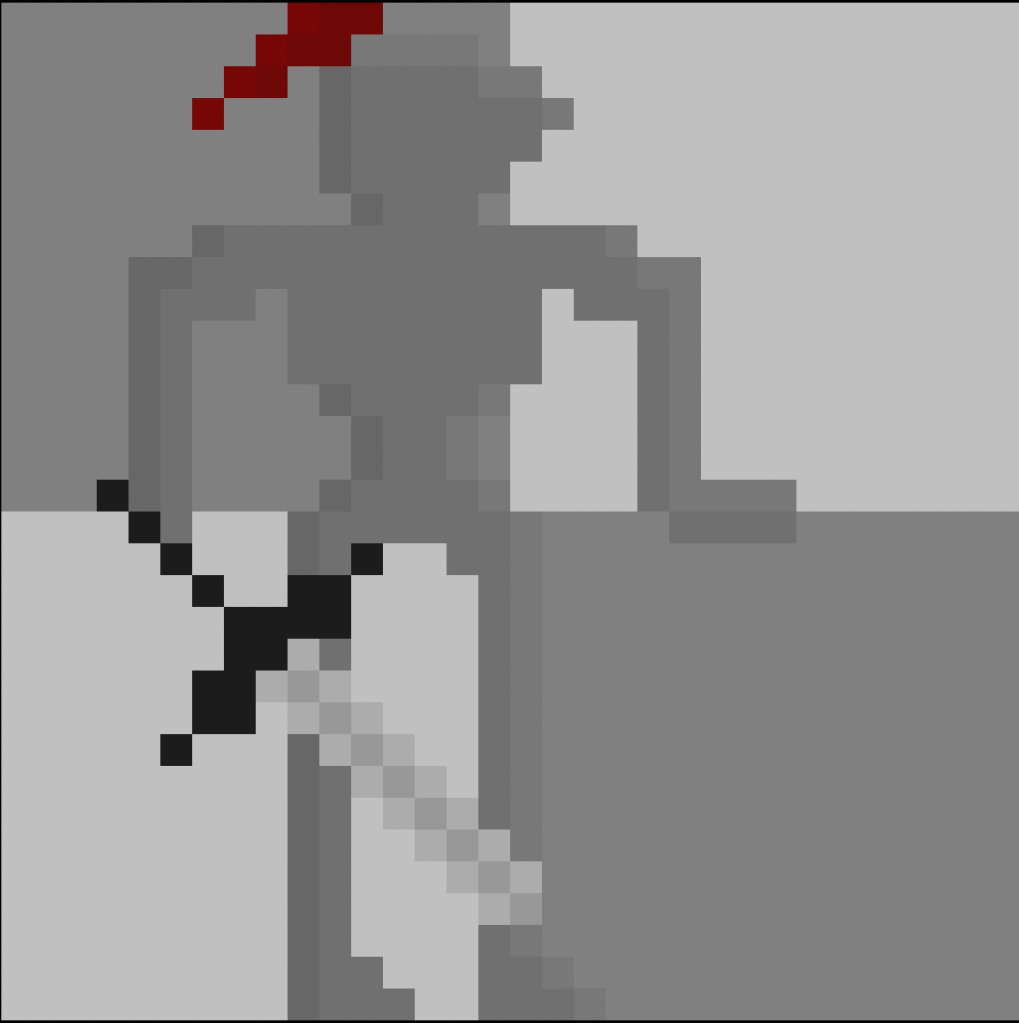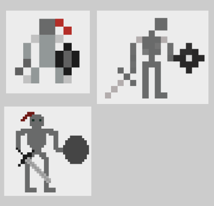 This is the main character in my video game. His description in the book Don Quixote, which is what I’m basing the game on, states that he is lanky. While designing him, I struggled with making use of every pixel. It was hard to convey that the character was a knight with only a few pixels, so I had to scale him up in order to get the right look.