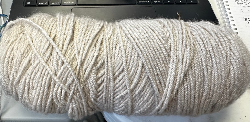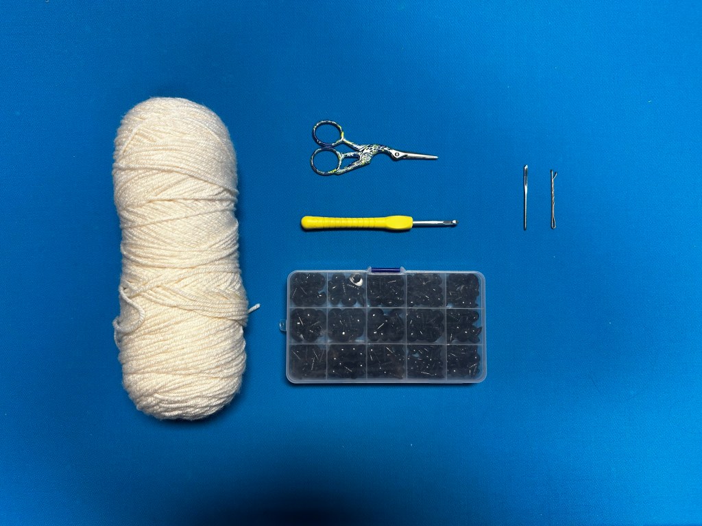 Pictured below for my initial materials is my leftover cream yarn, embroidery scissors, a large embroidery needle, a multipack of plastic eyes, a bobby pin for hair that I prefer to use as a stitch marker, and my crochet hook!
