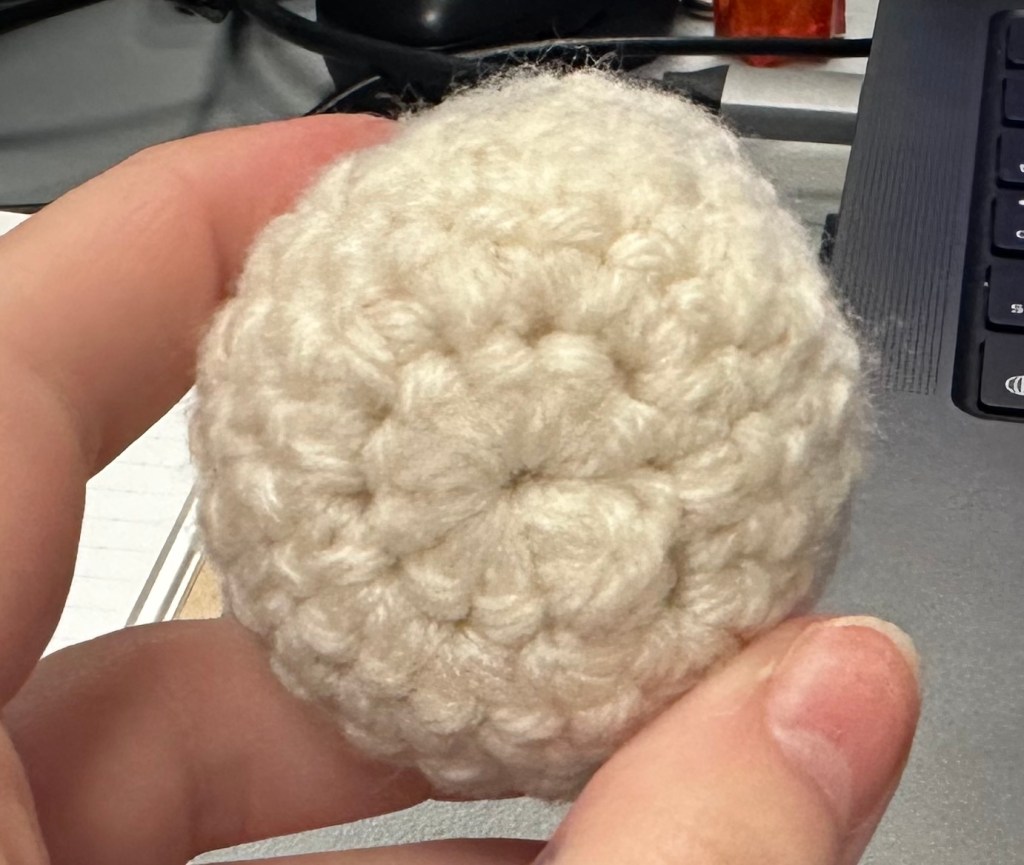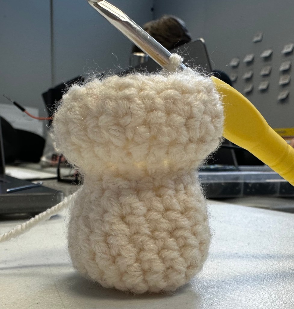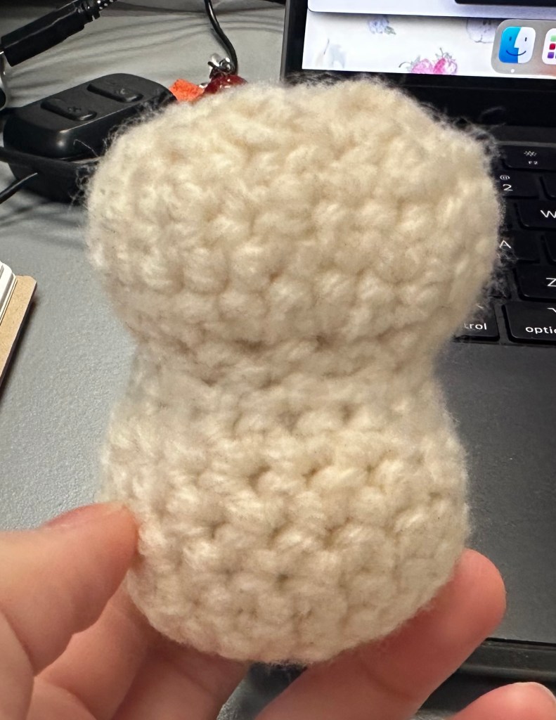 Once I have completed the body and head, I stuff the figure with polyfil as well as leftover yarn scraps to then sew up the head. * PLEASE NOTE that even if you have been crocheting for years, you will be prone to make a mistake. At this point, I should have inserted the plastic eyes and clipped them into place before stuffing and sewing together as this is the intended way. It is not fun to try and secure your eyes through your stitches once your figure is complete. As a last resort, my final projects eyes are not secured, they are simple held in place in between the stitches. LEARN FROM ME and don’t do that. *