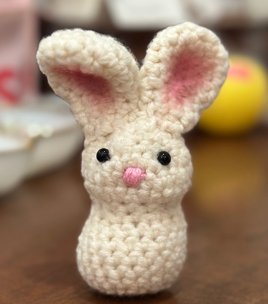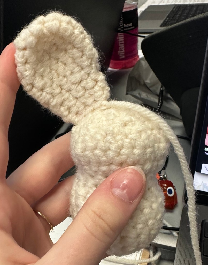 I then decide to try something new as I realize the bunny’s ears could use some color. I remember a technique I saw where a girl used chalk to add accent colors to her yarn, so I go to my bathroom and grab some blush to apply to the inner parts of the bunny’s ears!