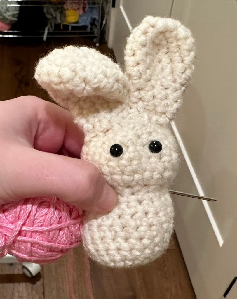 I grab some leftover pink embroidery yarn and stitch a small pink nose to my bunny. I do have to adjust the nose a couple of times to find the perfect location.