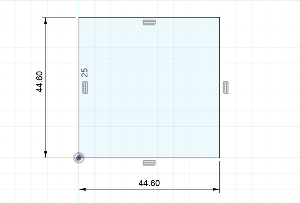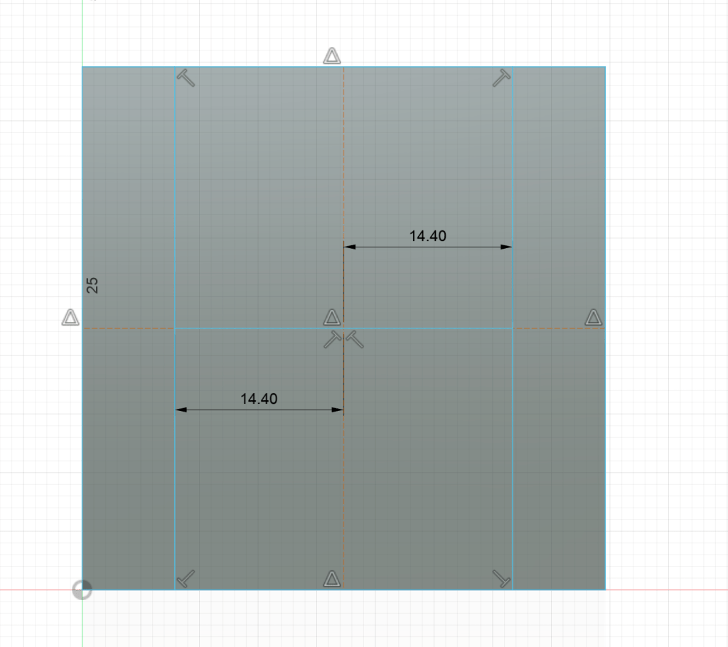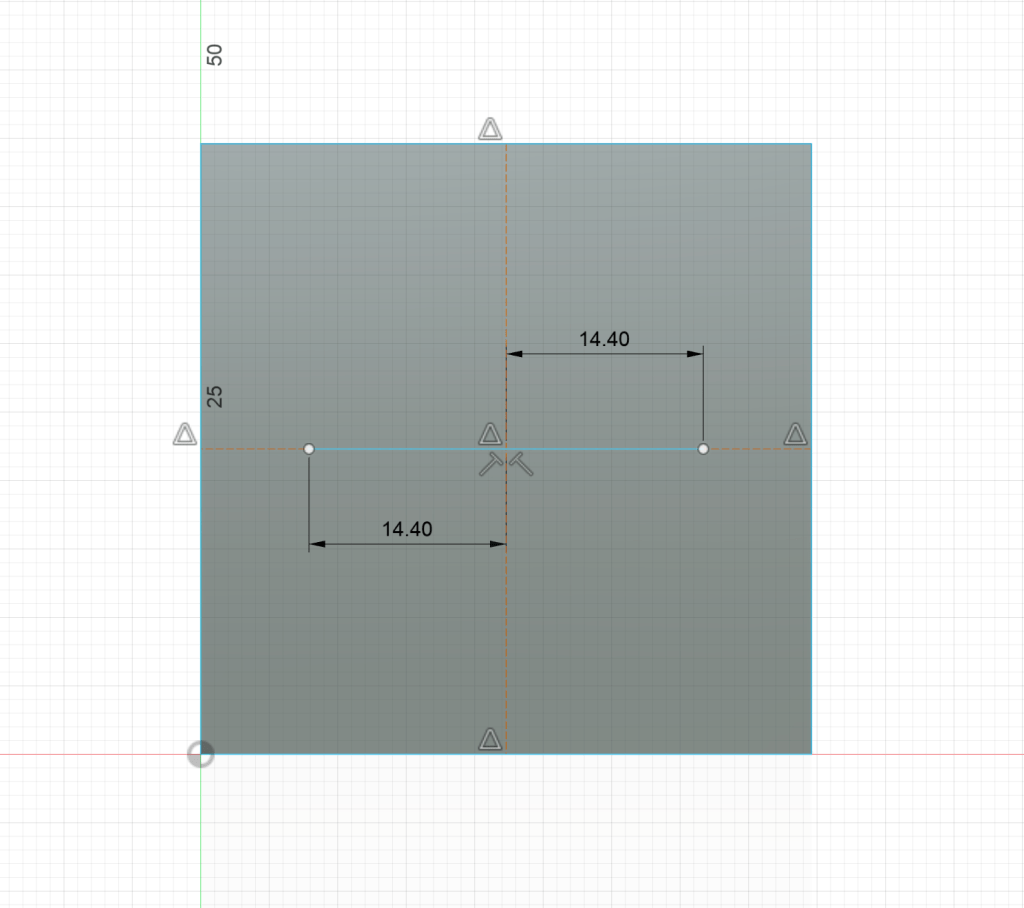 Now, using regular lines from the midpoint, extend left and right by half of 28.80 mm. In Fusion, you can type “28.80/2” and it will do the math for you.