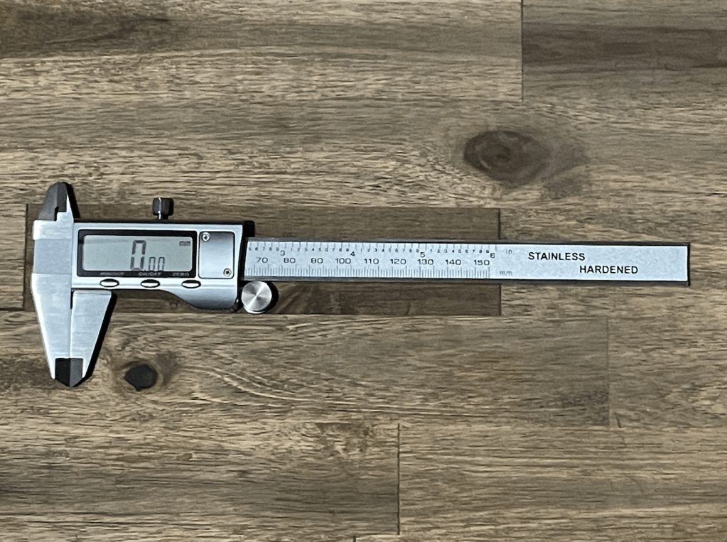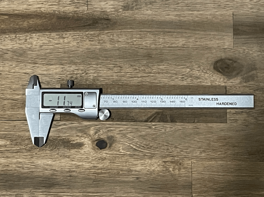 In this image, the caliper is closed but reading -11.74 mm. This means it needs to be zeroed. In this next image, it reads 0 when closed, which means it’s ready to use: