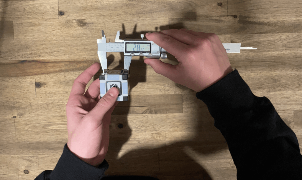 I opened the caliper just enough for the cube face to fit between the prongs, then closed it slowly until the cube stopped the caliper. The number on the screen is the measurement between the prongs.