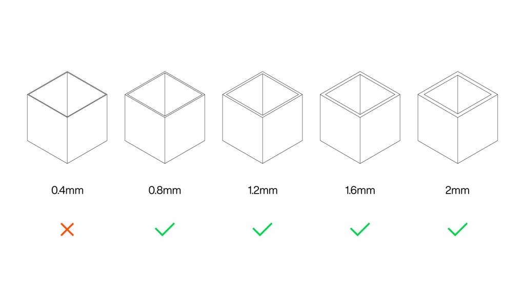 Thin walls also look cool, but they could also be weak or unprintable. When I’m making something, I generally keep my walls a minimum of 1 to 2mm thick. It strikes a nice balance between detail and durability.
