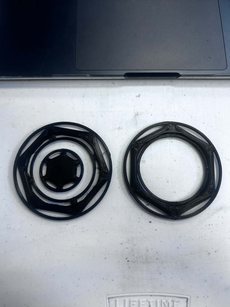 With Levi’s first model, the gaps between the design and the loop for crocheting were too small to be able to fit a crochet hook between. The thickness was correct though as the plastic had the same depth as crocheted yarn. After we discovered this, he made some modifications and Ryan went to 3d print it again.